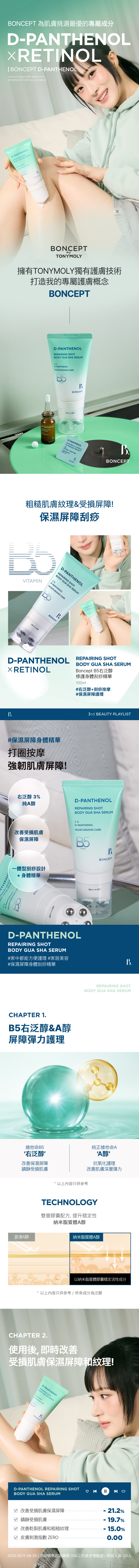 蘊含 3% 泛醇與純 A 醇,Boncept B5右泛醇修護身體刮痧精華專注於修護受損的肌膚屏障,深層補水並鎮靜乾裂與粗糙紋理。乳液般的彈潤質地,能在肌膚表面形成保濕屏障,持續維持柔嫩與光滑。經臨床測試證實,它能有效強化屏障功能,改善乾燥不適,讓肌膚回復健康狀態。搭配刮痧滾珠設計,能全面照顧身體各部位,特別適合需要屏障修護與保濕的居家護理客人。