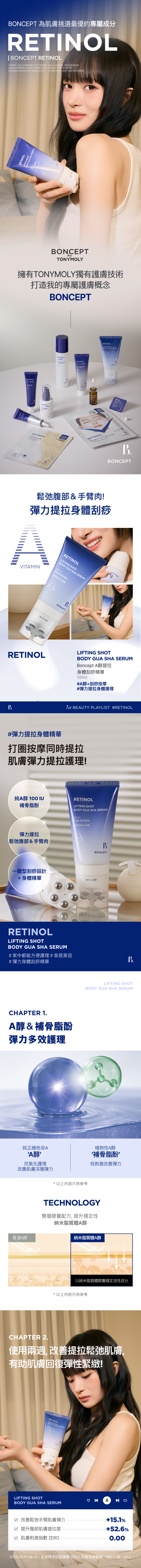 Boncept A醇提拉身體刮痧精華蘊含純 A 醇 100 IU 與植物性 A 醇(補骨脂酚),專為鬆弛的身體肌膚而設,能有效提拉並重塑緊緻感。質地水潤順滑、不黏笠,塗抹時帶來舒適的保養體驗。經臨床測試證實能改善手臂與腹部的鬆弛問題,讓肌膚回復彈性與勻稱線條。搭配刮痧滾珠設計,能照顧身體各個部位,成為居家高功能性護理的理想選擇。