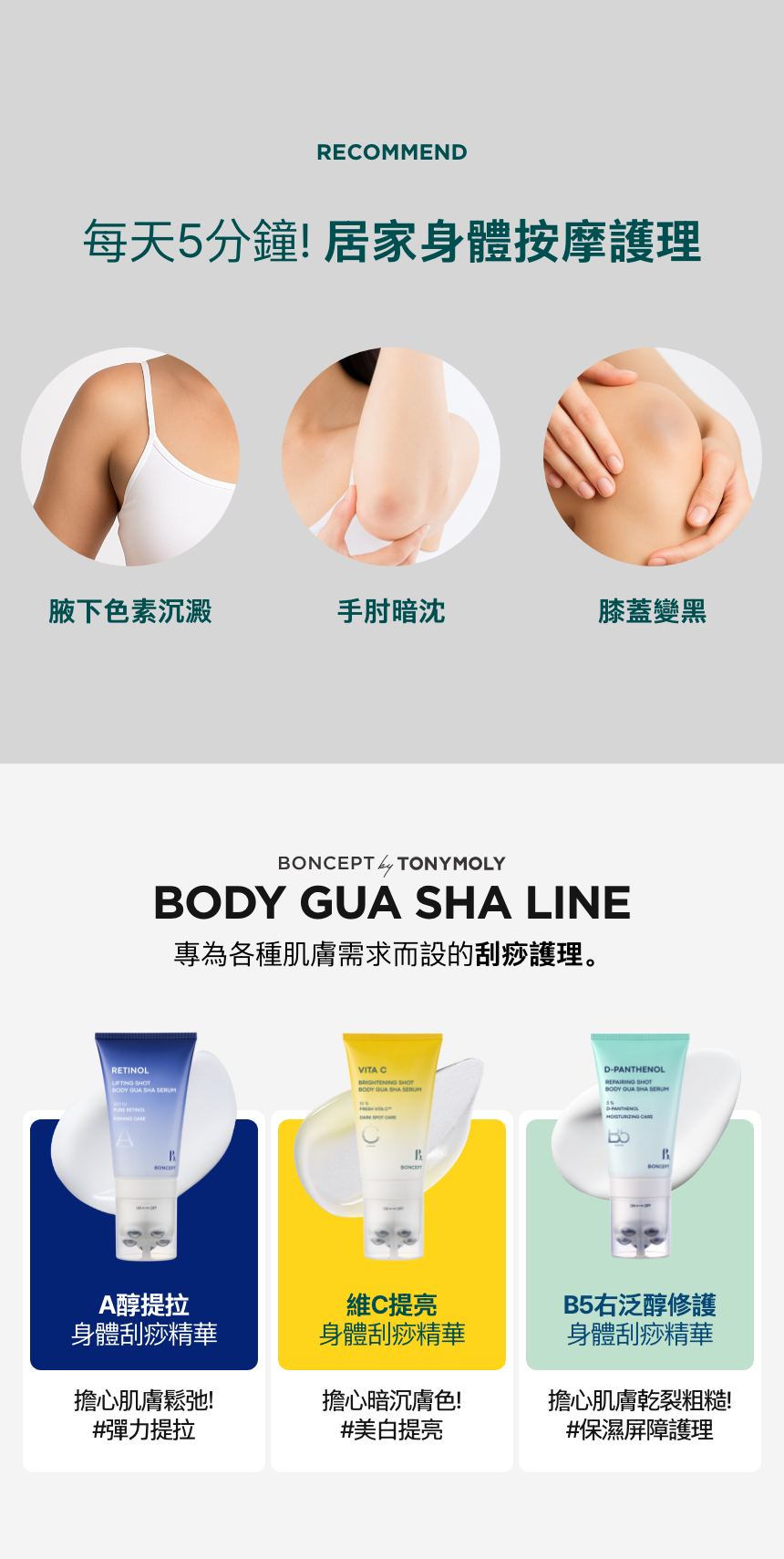 結合 Fresh Vita C™ 10% 與純 A 醇的高效配方,Boncept 維C提亮身體刮痧精華能針對暗沉與色素沉澱,為肌膚注入水分並提升透明感。質地清爽的透明凝膠,塗抹時輕盈水潤,適合日常使用。臨床測試顯示,它能有效改善腋下與手肘等部位的暗沉膚色,令肌膚更均勻亮澤。刮痧滾珠設計方便針對不同身體部位使用,讓居家護理更簡單,同時帶來明顯的美白提亮效果。