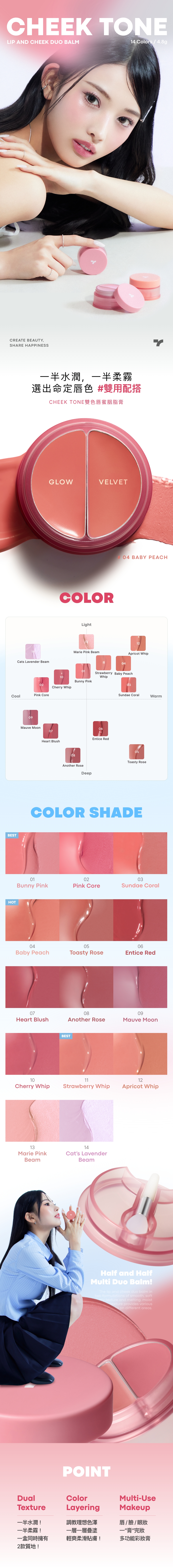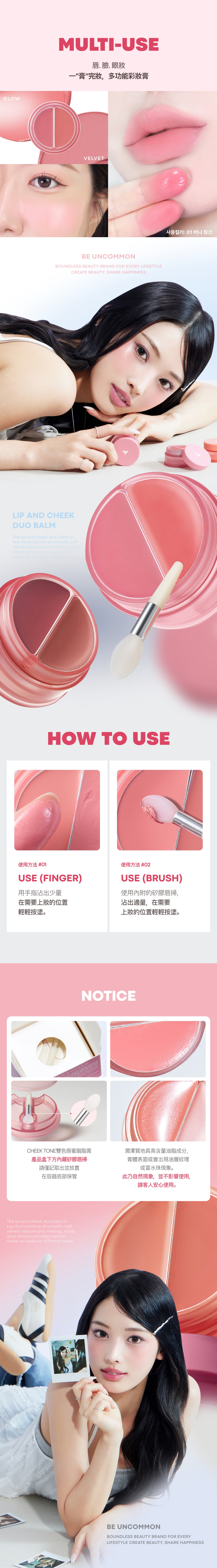 Cheek Tone Lip And Cheek Duo Balm combines two textures in one — a glossy, moisturizing finish and a soft, velvety matte. Designed for mix-and-match application, it allows you to create diverse looks for both lips and cheeks. The glossy side delivers a radiant glow, while the matte side provides a smooth, refined finish with natural layering. Enriched with Vitamin C, Vitamin E, amino acid moisturizers, and Palmitoyl Hexapeptide-12, it nourishes and firms the skin. Hydrating oils and brightening agents smooth fine lines and lock in moisture, while oil-control powders keep makeup fresh and long-lasting. A built-in lip brush makes touch-ups easy anytime, ensuring you can carry it with you and maintain a healthy, vibrant look throughout the day.