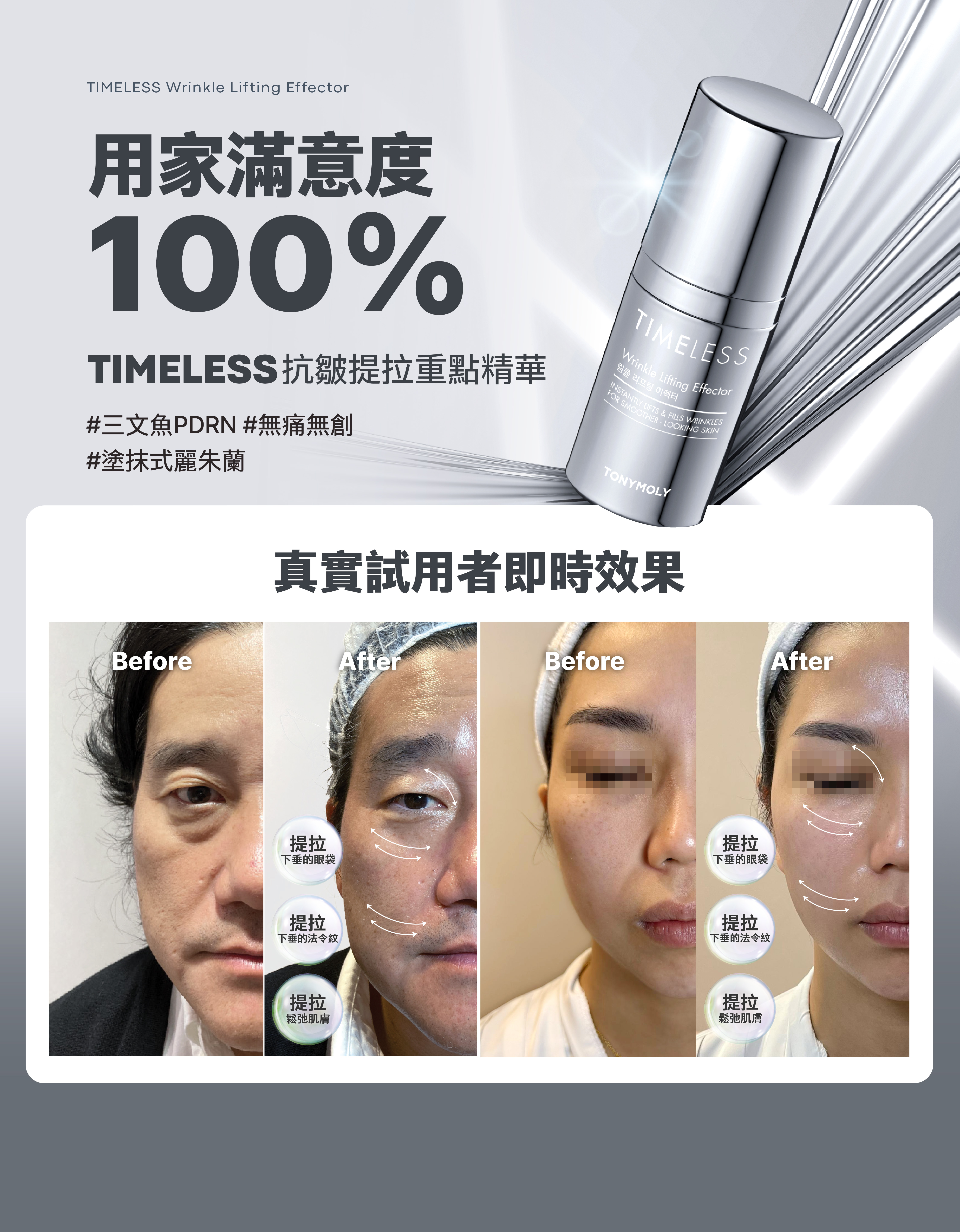 臨床測試顯示,使用Timeless抗皺提拉重點精華後,1 分鐘即可感受淡紋提拉效果