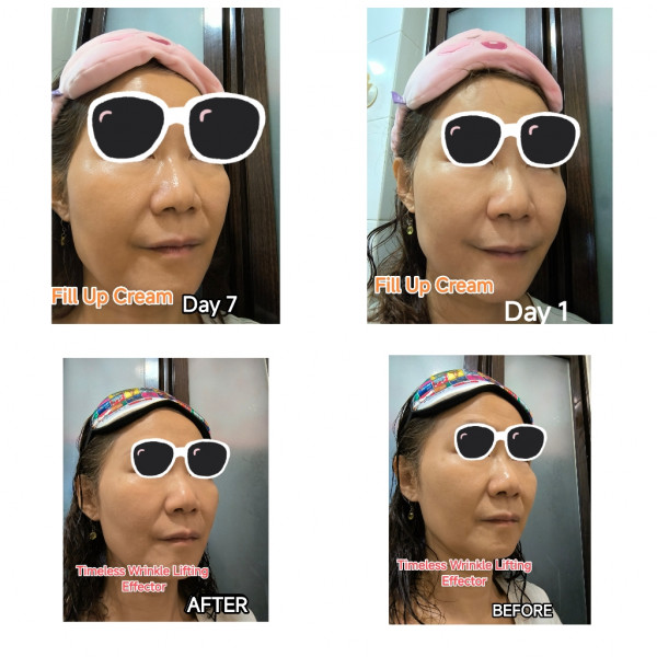 我面部最大的問題,是眼袋比較明顯,及法令紋逐漸加深。收到產品後,開始每晚使用 Fill up cream, 兒梅椒化妝前就以 Timeless Wrinkle lifting effector 先打底吸收,再加上簡單的化妝。