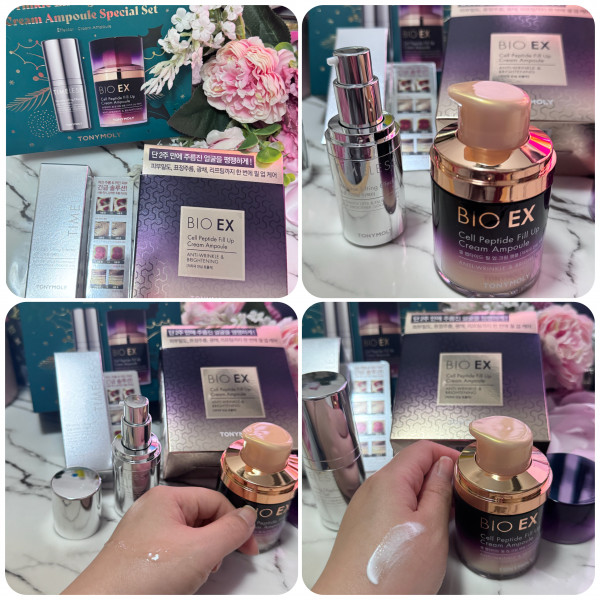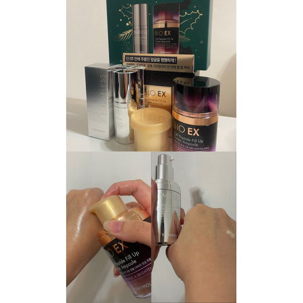 方法: 潔面後,拍上爽膚水後,我先塗上Timeless抗皺提拉重點精華作按摩,然後再塗上BIO EX胜肽活膚修復乳霜安瓶,用手均勻地塗在面上