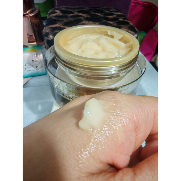 4.講到面霜我都用左好多年!啫喱乳霜狀,質地非常輕盈,上面有種涼浸浸嘅感覺,好快就吸收,完全唔會有厚重或者焗住嘅感覺。當中24K黃金可以抗氧化、促進微循環,幫我改善成日捱夜嘅暗黃膚色,用完塊面光澤感重左~~仲有人蔘同egf修復再生力upup!細紋同鬆弛都有改善 ~