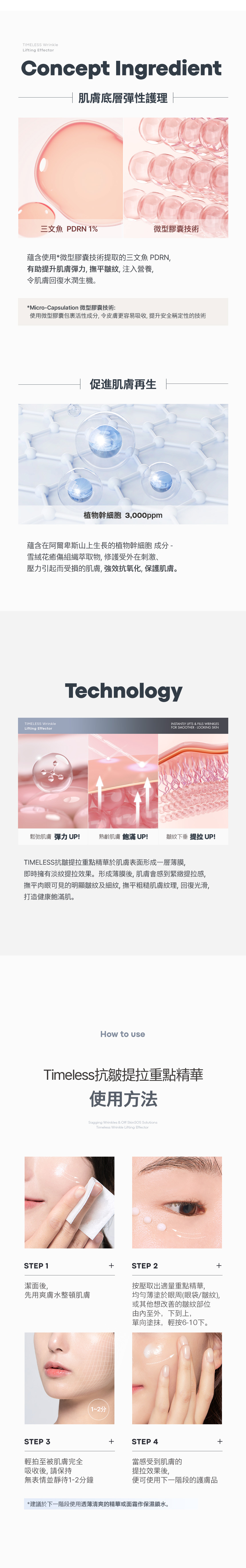 TIMELESS抗皺提拉重點精華:皺紋下垂 &熟齡肌膚,SOS 急救法,美白抗皺雙重功效護膚品;皺紋下垂、熟齡肌膚、鬆弛肌膚、提拉UP! 飽滿 UP! 彈力 UP! 以上內容只供參考,使用效果因人而異。